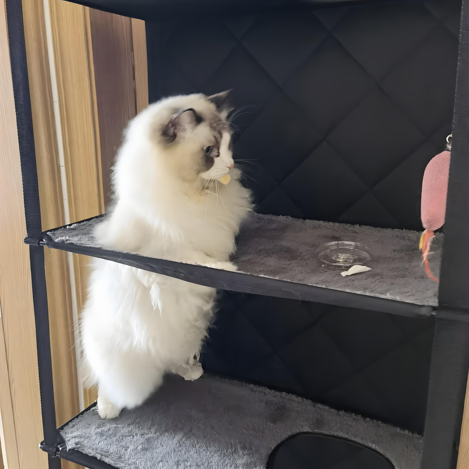 - This door mounted cat climber cat furniture's unique design allows the entire cat condo to be folded flat against the door without removing it.