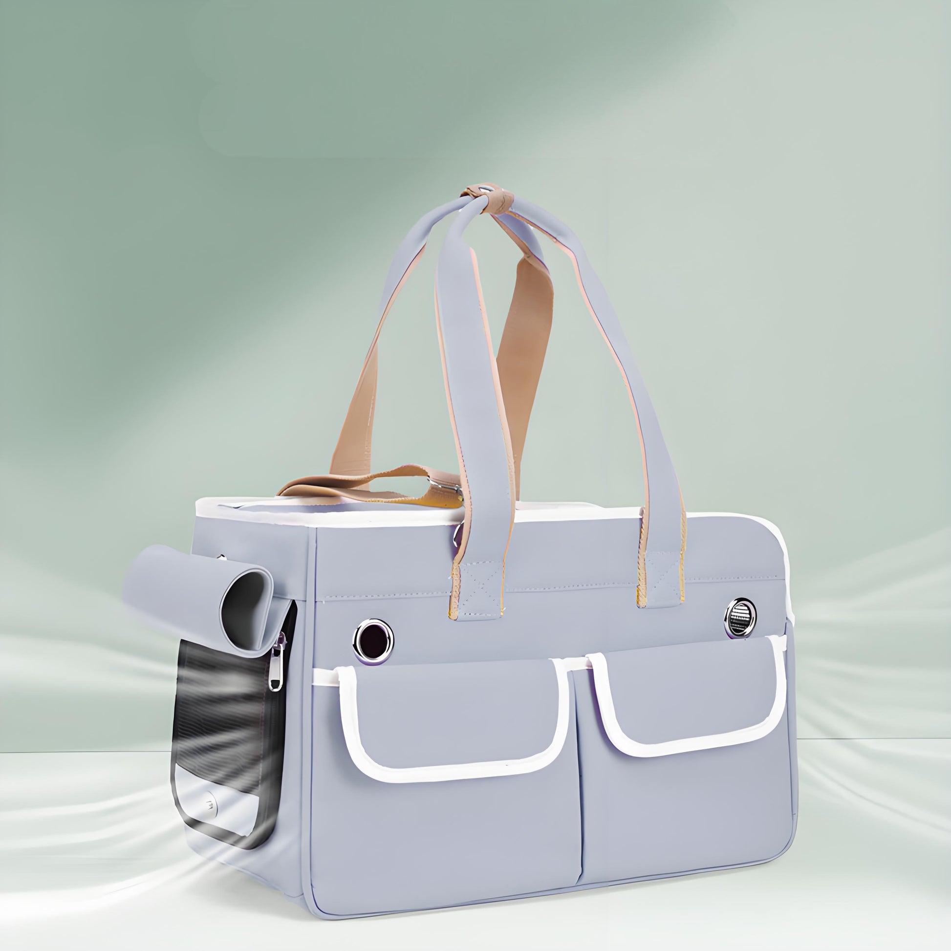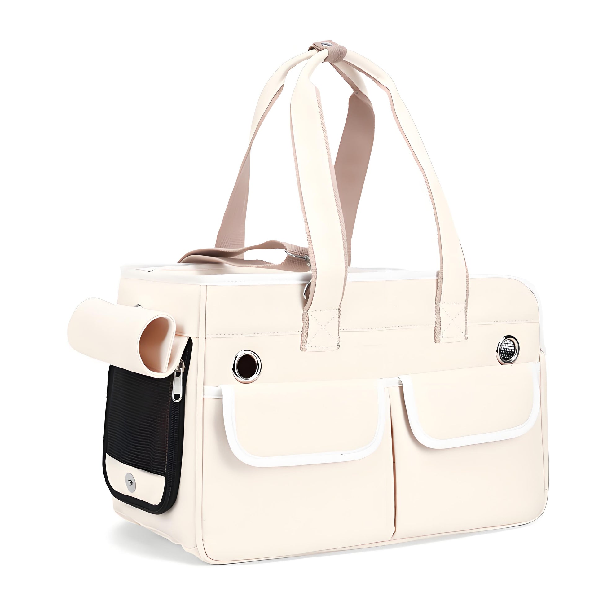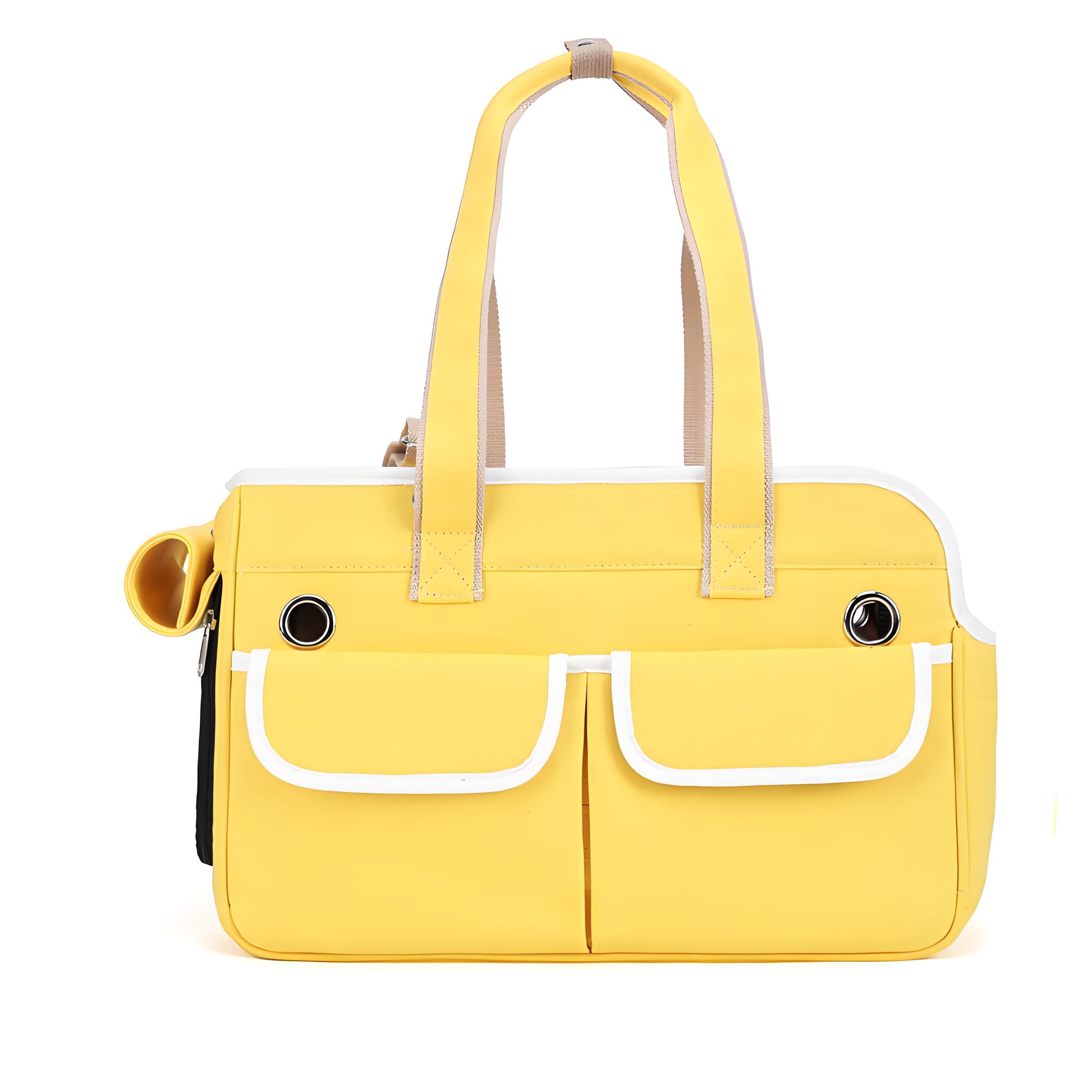 - Two front pockets with white trim provide convenient storage for treats, toys, and other pet essentials.