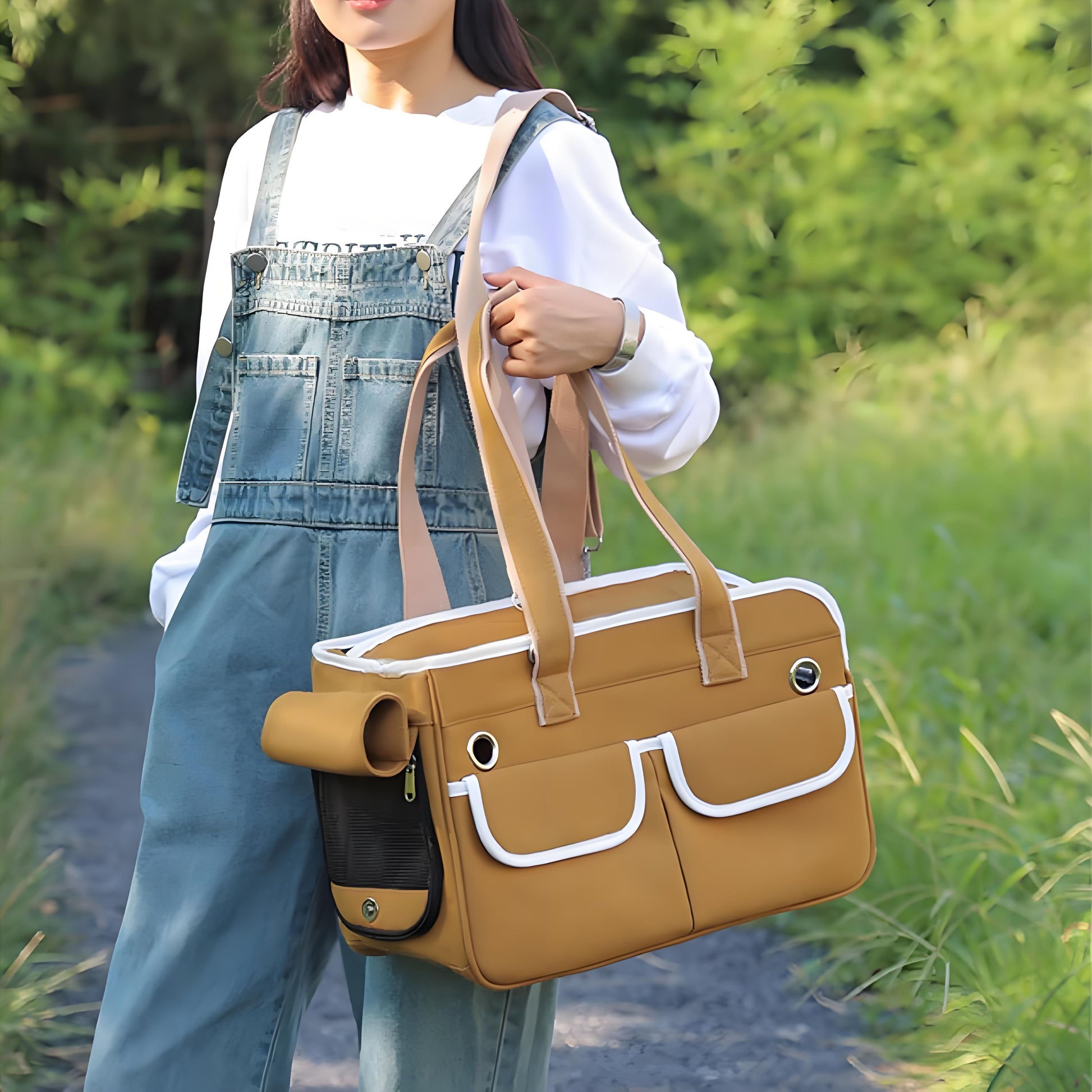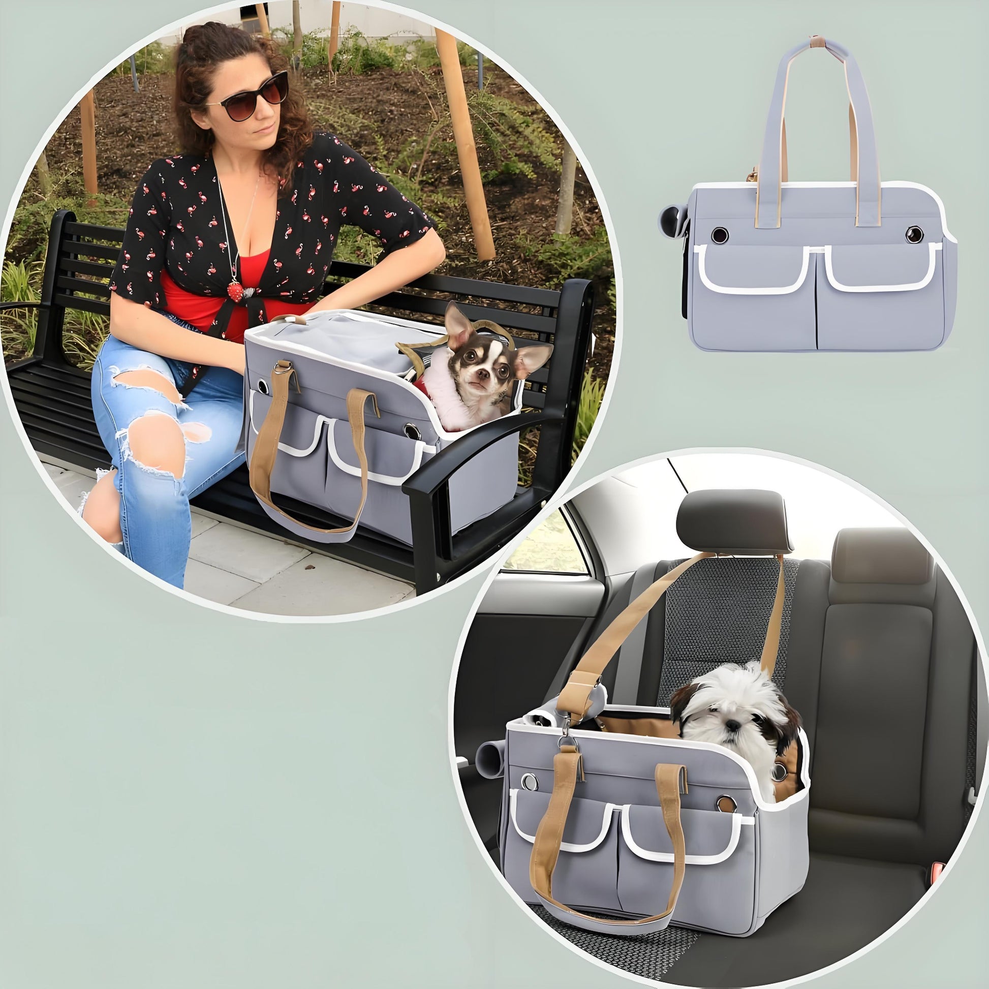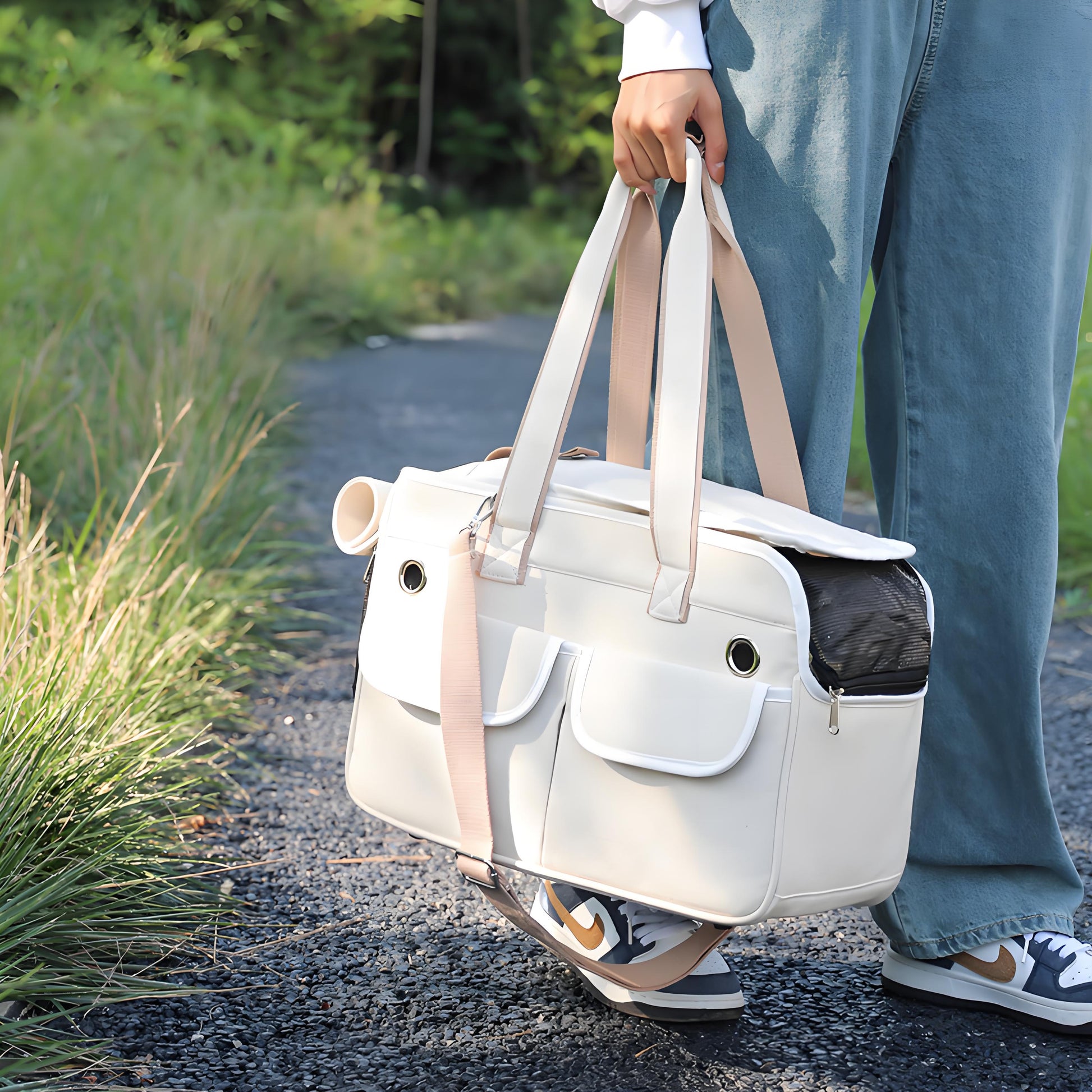 - Two front pockets with white trim provide convenient storage for treats, toys, and other pet essentials.